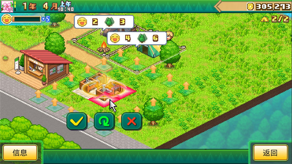 5、布局:布局的话目前我没有查到相关的一些资料,可能是游戏太新,但根据游戏的内情况来看越高的场地受欢迎程度就越高,顾客对绿植等观赏设施要求会比较多,房子比帐篷人气会更高,房子周边需要的设施基本上不需要太多,因为一天下来的话每个人顾客最多也就可以去2-3个游乐设施,再多也没有时间玩,所以可以适当按不同类型的设施去跟露营地结合排布,另外,如果阶段性对某种点数需求比较大的话,可以集中在人气度最高的露营地旁摆放可获取此类点数的设施。