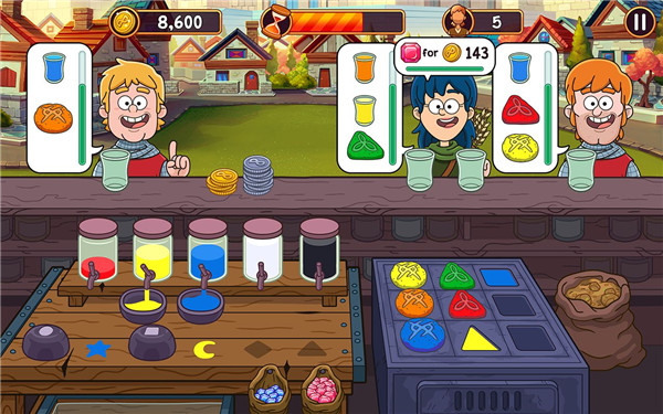 调配药剂饮品的过程很简单,没有复杂的原料采集,也不用特别烘焙制作等待,玩家只需要在规定的时间范围内完成任务即可,像是烤蜥蜴小吃这些,刚开始就可以预算好来,先烤着一份,饮料瓶也可以先装好一杯饮品,错了倒掉就可以,但是要注意浪费要有度,不然钱赚不够就赔大了。当然如果你出色完成任务,会有2倍的金币奖励喔,刚开始虽然轻松,但随着等级的提升,游戏难度也会随之增长,为了让难度变大,除了“红、黄、蓝”这三种基础饮品外,还需要你通过加法来调出其他颜色——橙、紫、绿或棕色等。经营过程中会出现“特别顾客”,相当于美食家一角,给你增加难题,像是市长 Polly T. Sean 和勘探者 Boar O'Mear都会偶尔光临你的酒馆。