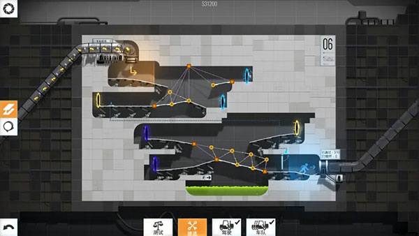 上色。这一关增加了不同颜色的传送门,相同颜色的传送门进出。铺设桥面,连接两个点,进行硬化,使用三角形结构加固,即可通关。
