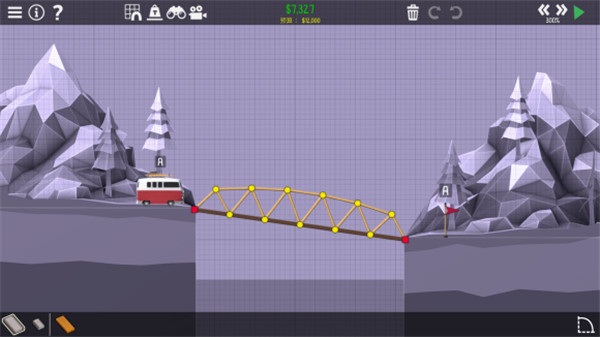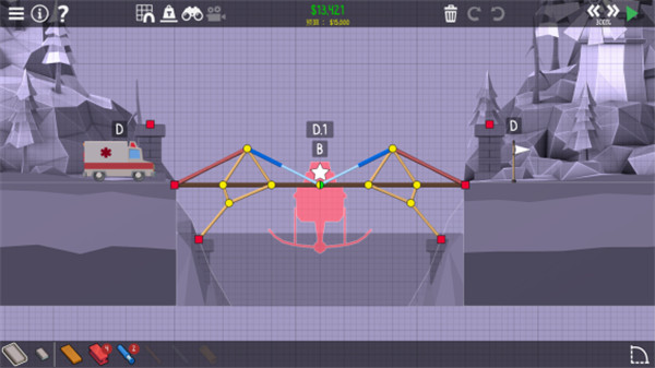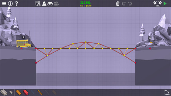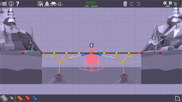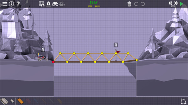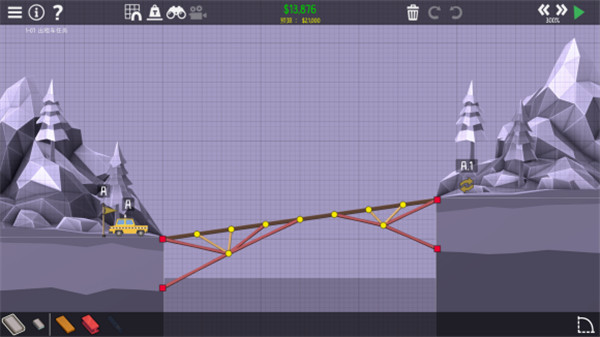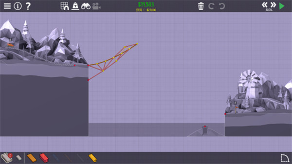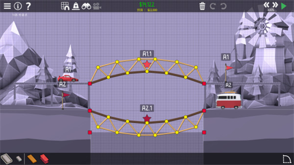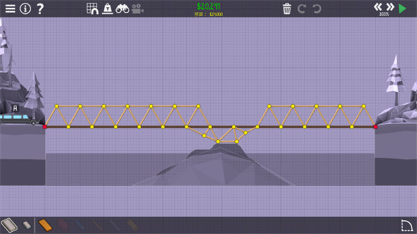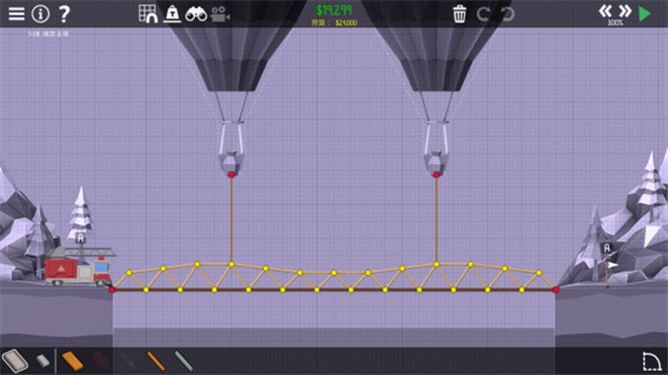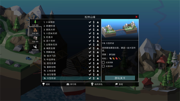 另外,桥梁构造者2为玩家准备了两种关卡玩法,它们分别是,世界闯关模式和沙盘模式,在世界闯关模式中,有着丰富的关卡供玩家挑战,不同的地形有着不同的建造难度、不同的桥梁所需的材料预算也各不相同,所以玩家需要充分的结合物理学,在尽可能减少材料预算的情况下建造出牢固的桥梁。而在沙盘模式中,玩家可以模拟不同的建筑方式,以此找到最佳的建筑步骤和方法,并且桥梁构造者2还在该模式下提供了液压装置,它可以让你减少材料的同时还能让桥梁变得更加牢固,十分的不错。除此之外,桥梁构造者2值得一提的便是新增数个场景及道具,它们可以让你在建造的旅途中充分的体验游戏的乐趣所在,感兴趣的小伙伴们还在等什么,快来挑战吧。