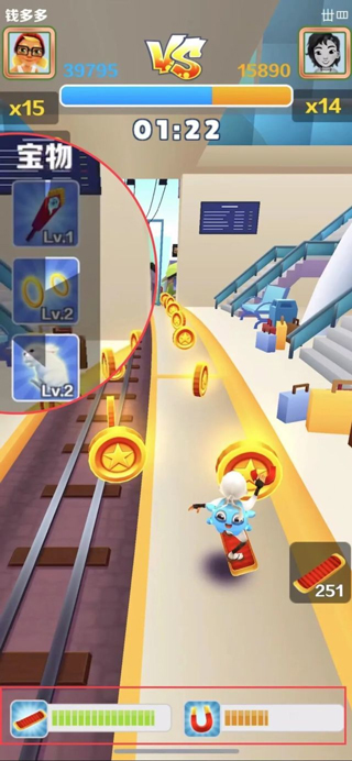 3、在游戏中不能够使用超级喷射起跑以及得分倍增道具,只能够使用超级滑板,但是我们可以在开局之前装备好自己需要的宝物能增加得分并且获得免费道具。