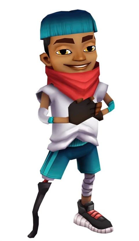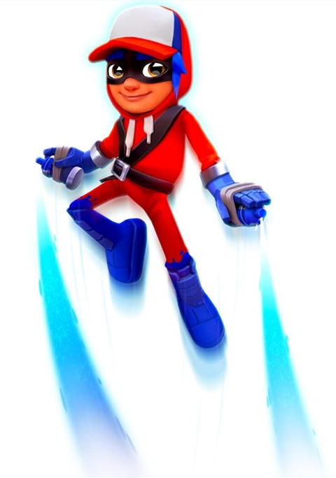 杰克的超级跑者服装包括红色连帽衫,没有地铁冲浪者标志的棒球帽,黑色多米诺骨牌面具,安全带,蓝色手套和靴子,头发和眉毛染成蓝色。超级跑者杰克还拿着两个喷漆罐。