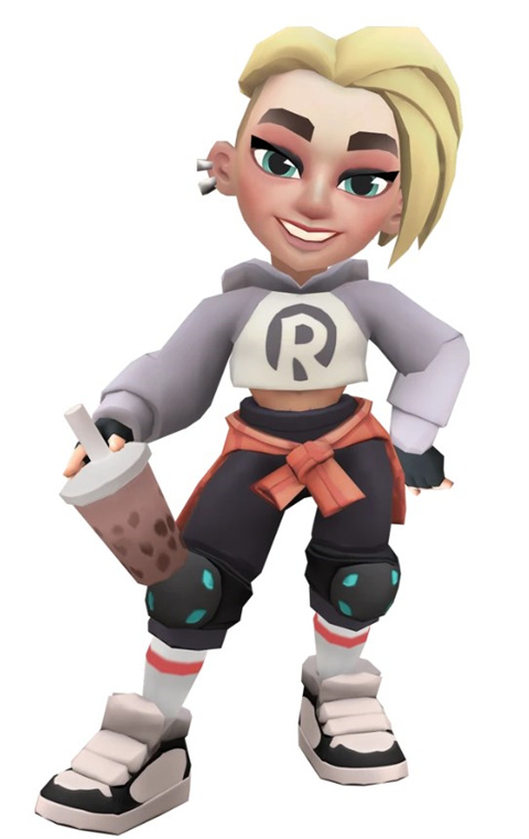 Catrine是来自地铁城的女孩,她有一头金发,她穿着底裤,她有一双青色的眼睛。她穿着一件紫色九分款连帽衫,胸部区域有一个R,她还穿着深紫色的运动裤,上面有护膝,她还有无指手套(类似于杰克的深色服装)。她穿着带有橙色条纹的灰色袜子,以及灰色和黑色运动鞋。