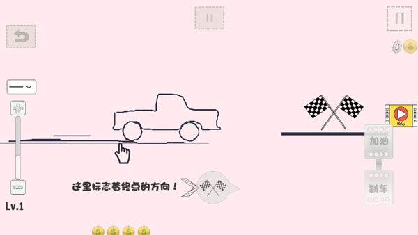 这款游戏玩法非常简单,在游戏开始前,我们需要画好车子,注意一定要是有轮胎的车子,轮胎就在屏幕的下方就可以看见。然后可以根据终点来路线,左下方有加油和刹车两个选项,右边可以调节查看的视角。调节右边,可以看到大致看到我们的车子与终点的距离,然后画出路线,踩下油门,到达终点就可以完成任务。这款游戏一种有两种模式,分别是关卡模式和无尽模式。