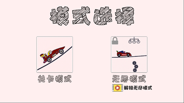 而无尽模式比较凶险,不能踩刹车,只能一直往前冲刺,在路上我们很有可能因为一些失误而画出一些诡异的障碍,当车子底朝天的时候,我们的闯关将会结束。只要我们没有失去踩油门的能力,这个模式将可以一直玩下去,蛮有意思的。