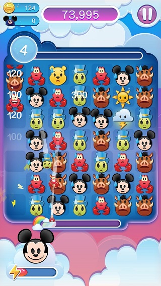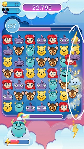 2、游戏开始后跟其他游戏一样滑动三个表情一样即可消分。不过四个可以产生带闪电的云它会消除一行