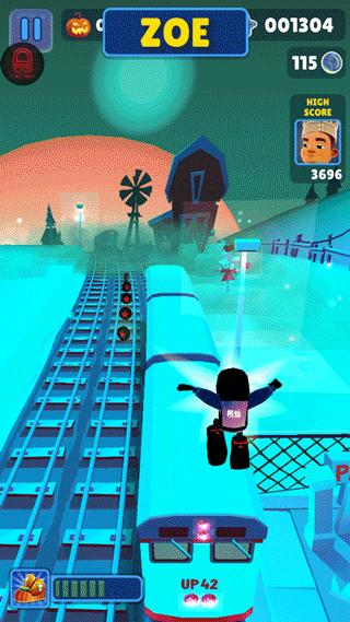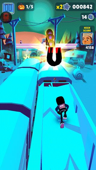 滑板:通过双击屏幕来启动滑板,滑板会持续一段时间。在没有滑板的情况下,角色撞到火车或者障碍等都会被抓住,导致游戏结束。但在有滑板的状态下,角色就有了一道保险,撞到火车等的时候,滑板会消失,游戏可以继续进行。