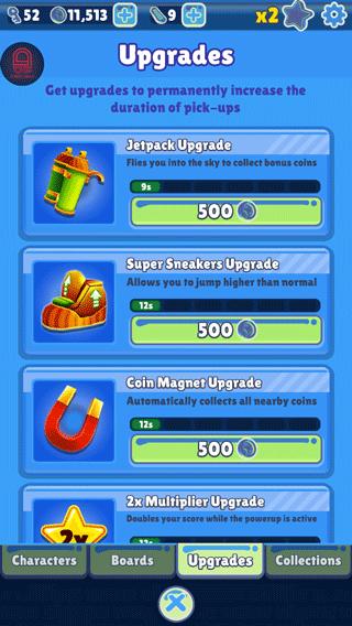 升级:通过金币购买,可以升级道具,使得道具的持续时间更久。升级路线可以按照自己喜好来,不过推荐优先升满喷气背包。