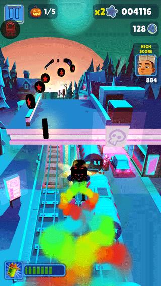 跳跳鞋/弹簧鞋:获取跳跳鞋后,角色弹跳力大为增加,跳越更高更远,但滞空时间、落脚地点也更难控制,它可以跳上火车,也可以在门洞处跳到墙上自杀,对于新手来说,跳跳鞋更像是噩梦,它会让你犹豫不决,它会让你做出很多错误的判断来终结游戏。但对于老鸟来说,跳跳鞋可以被称作神器,在越来越快的后期,跳跳鞋可以直接省去很多费神的小操作,效率也非常高。