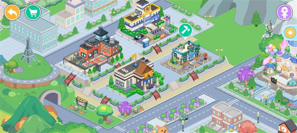 2、丰富的游戏世界中,展现可爱的卡通人物和各种建筑物,自由探索。