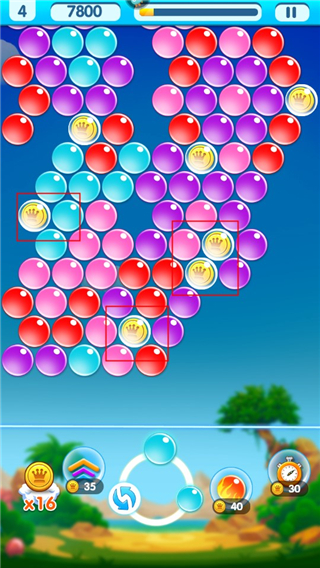 1、火球、炸弹、铁球、多色花等多种道具能助你轻松取得皇冠。
