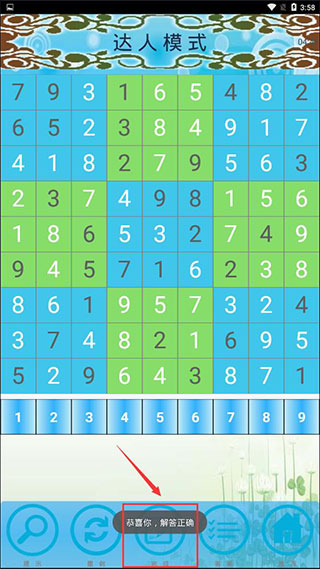 5、或者玩家也可以手动解答,当你填完表格之后,可以点击正下方的【完成】按钮,如果填写正确,会提示恭喜你,解答正确的消息。