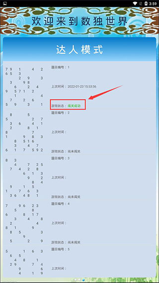 6、返回【题目页】,我们就可以看到刚才成功完成的数独表格,并有闯关成功的标记。