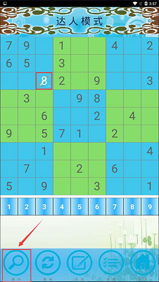 3、如果玩家不太确定格子里应该填什么数字,可以直接点击左下角的【提示】按钮,游戏会自动生成正确数字填入铅笔处。