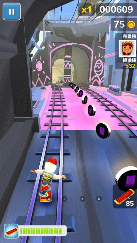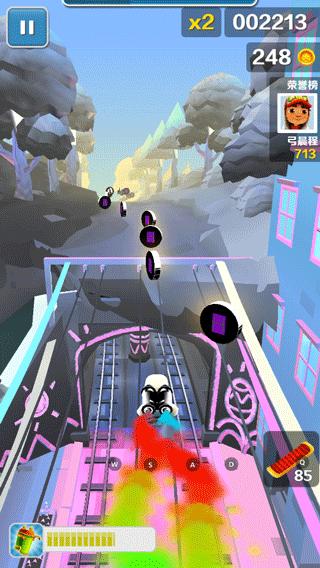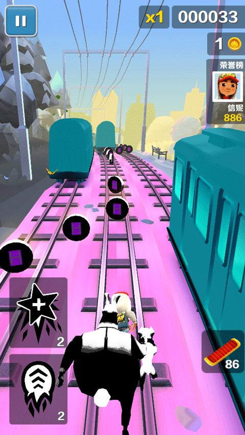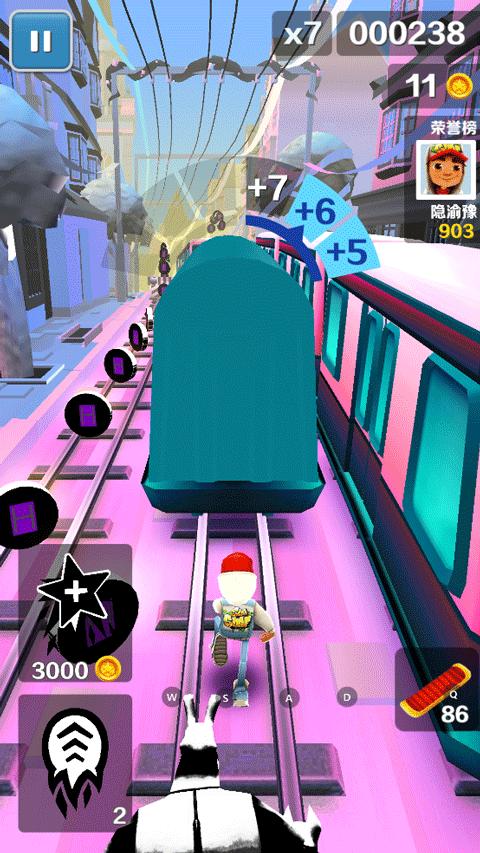 2、开局一段时间内可以使用左下角的道具,得分翻倍和开局冲刺,它们会给你的跑酷带来更多得分。