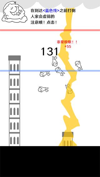 需要注意的是塔顶越过红线时则会Game Over,塔顶没到蓝线时降下天雷,在一段时间内没法使用天雷哦,非常考验玩家的手速反应能力,在游戏画面上十分的精简恶搞,动画及语录十足的骚气,乐趣无穷的游戏玩法,喜欢的玩家千万不要错过,欢迎下载。