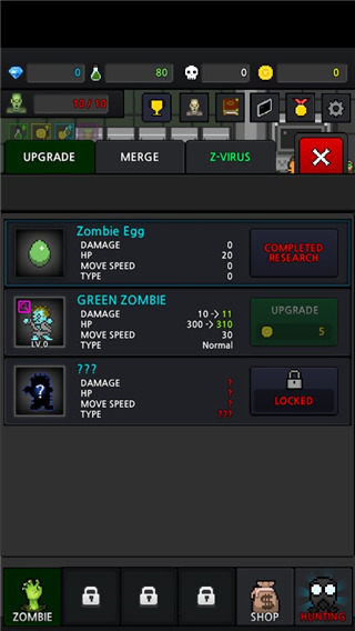 随着狩猎的持续进行,你所遭遇到的人类也将会更加强大,为此,提升僵尸的能力或者降低人类的防御和攻击,就是接下来需要完成的操作了,进入“僵尸”升级僵尸,可以提升僵尸的伤害值、体力以及移动速度,或者减少生产期间的冷却时间;还可以追加病毒研究,增加僵尸类型和容纳数量;其次升级研究所,实验室,开发出古代遗迹,提高所有僵尸的能力。