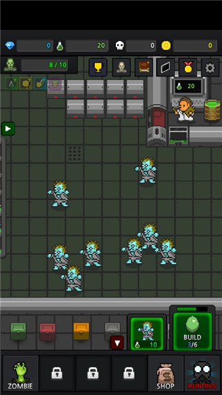 首先进入游戏后,玩家需要通过点击生成僵尸蛋,将通过对僵尸蛋的点击来获取僵尸成品的研究药水。但初始容量有限,玩家只能生产十个僵尸,接下来僵尸生产完成之后,便要开始下一步的操作,那就是“狩猎”环节,进入狩猎,并按照以下操作就能在消灭人类的同时获取各种战利品啦。