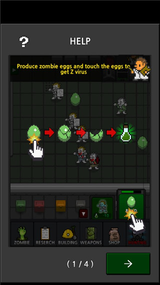 2、生产僵尸蛋和接触蛋获得Z病毒,你可以用Z病毒制造僵尸,也可以通过组合相同级别的僵尸来创建高级僵尸;