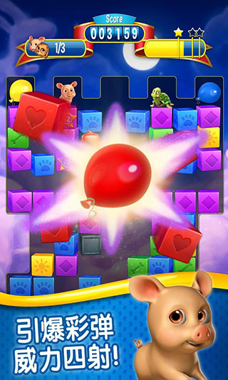 2、匹配两个或更多同色砖块来移除障碍,从邪恶的宠物大盗手中解救宠物。