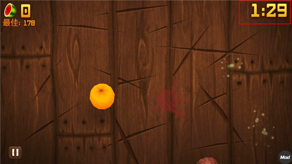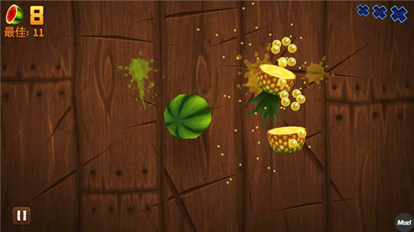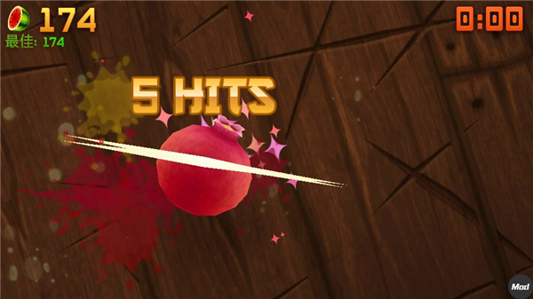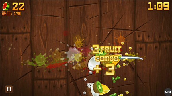 3、一次削一个水果获得1分,一次连续削两个水果获得2分,一次连续削三个以上水果,出现Combo效果,获得本次所削水果数量两倍的分数。