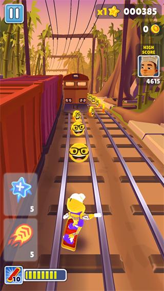 玩家们在游戏中不仅要收集金币,扑面而来的火车也会让你累够呛,在这个过程中你可以使用道具,加速道具能够让你快速前进,使用滑板可以帮助你多出一条生命,点击屏幕两次可以使用道具。