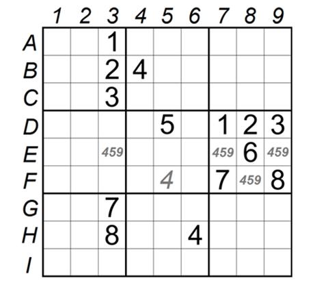 数对占位法,在上面的宫内数对占位法中,我们已经学过数对占位法,这里讲的是数对出现行列里的情况,这时的观察难度会大大增加,本技巧也属于难度较大的技巧之一。