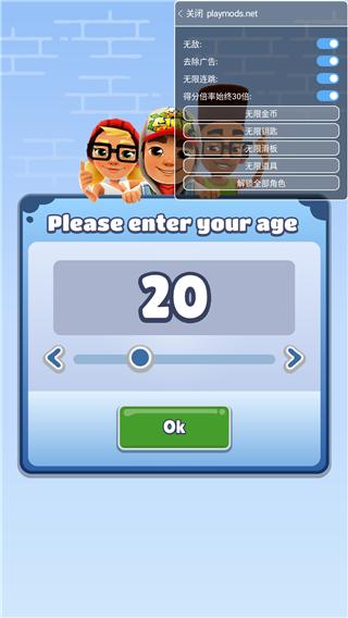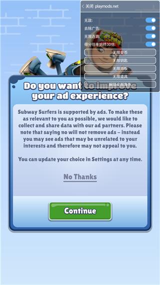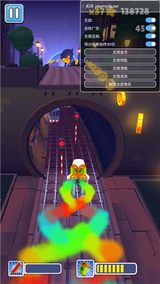 4、在mod菜单栏内可开启无敌、去除广告、无限连跳、得分倍率始终30倍、无限金币、无限钥匙、无限滑板、无限道具和解锁全部角色;