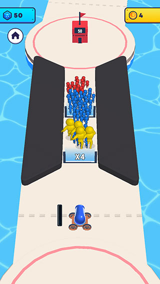 2、按住大炮不松手就可以源源不断地发射出炮弹人,炮弹人经过倍数门会获得数量上的增长,建议朝着倍数较高的门发射。