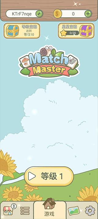 1、打开匹配大师手机版,开始关卡,左上角为昵称,30级后解锁,右上角是金币,累计一定量就可以解锁其他宝箱啦。