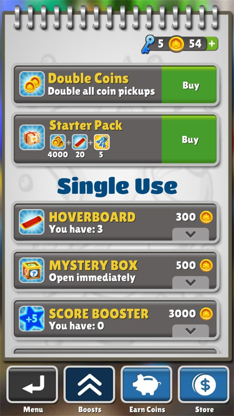 常见道具有:火箭推进背包,该道具可以让角色飞起来一段距离并沿路收集金币;超级运动鞋可提升角色正常情况的下的奔跑速度;金币磁铁可将帮助角色收集附近范围内的所有金币;双倍积分可让一定时间内获得的积分*2,以上这些道具都是有持续时间的限制,所以使用时一定要把握好时机,将收益最大化