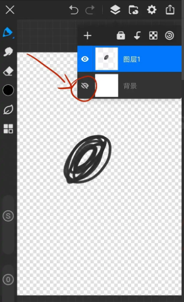 6.将背景图层前面的【眼睛】点击一下,背景图层就被隐藏起来了,画布的背景颜色也从白色变成了透明底
