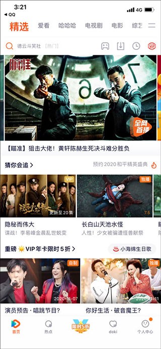 2、然后会看到首页、热点、会员、diki、个人中心五个板块,其中在首页中包含了精选、爱看、哈哈哈、电视剧、动漫、电影、综艺频道等诸多频道;