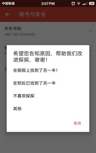 5、我们点击注销账号,然后再这里选择自己的原因就可以注销探探号了。