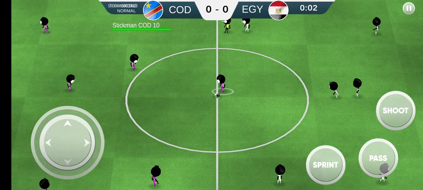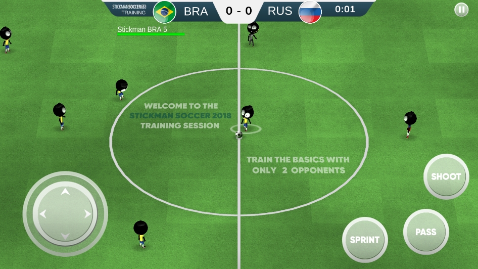 2、之后会进入培训,左方虚拟按键控制角色移动方向,右方虚拟按键分别为传球、射门、进攻,玩家需要控制火柴人带球过人,将球射入对方足球框中即为得分。