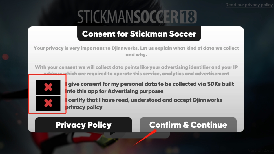 1、首先,玩家在本站下载并安装好游戏之后,打开进入,先点击下图这两处地方,然后再点击【confirm&continue】。