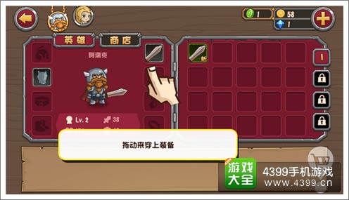 2.购买或出售装备:在商店中会随机出售一些装备,每通过一个关卡后也会奖励一件装备及一些金钱还有一笔少量的钻石。玩家可以在商店出售无用的装备,并购买需要的,个人感觉游戏中的金钱和钻石是很吃紧的,钻石获取难度太大,可能技能无法点亮。另外无法使用当前装备的角色头像会以红色背景显示。玩家也可以通过使用金币和钻石来刷新商店列表。游戏初期不推荐如此。