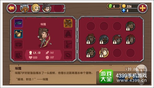 4. 雇佣新的角色及调整组队队员:在 队伍 中可以用钻石 绿币 RMB购买新英雄。最开始只有骑士和牧师两人,随着游戏发展可以在队伍中雇佣刺客,弓箭手等。然后在队伍中调整小队的成员。不过在其中中坐冷板凳的队员是不会增加经验值升级的,因此建议玩家们在初期选择好自己的4个主力队员并重点培养。英雄只分职业,同职业的,免费跟绿币RMB买都一样属性。