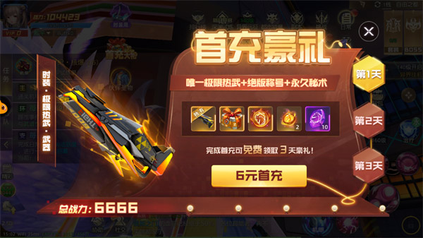 U1S1,首充礼包一般都是游戏里面最划算的礼包,异能都市也不例外。完成首充即可免费领取3天豪礼:唯一极限热武时装+绝版称号+永久秘术(分3天领取完毕),这对角色战力的提升是一个绝佳的机会。一个武器时装战力6666,在【机甲试炼】关卡是非常重要的,当你的机甲处于冷却转态时,高战斗力的武器可以帮助你在限定的时间内击败BOSS,解锁其他机甲配件。