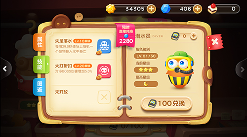 潜水员萝卜拥有着两项非常恐怖的伤害输出加成技能:“失足落水”和“大打折扣”失足落水能够帮助玩家们每隔29秒就能够秒杀一个场面上的怪物,怎么样是不是很逆天?大打折扣则能够使玩家们对小BOSS的伤害直接加成5%,算得上是加成攻击技能当中的佼佼者。就目前来说潜水员的获得方式有一下几种: