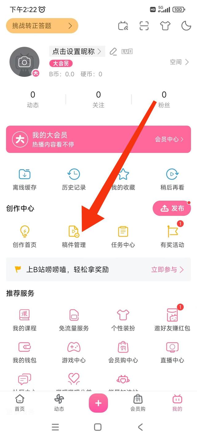 2、在个人主页,找到创作中心,点击“稿件管理”进入
