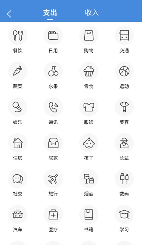 4、切换到“记账”页面,点击“+”,选择支出/收入,选择对应的图标;