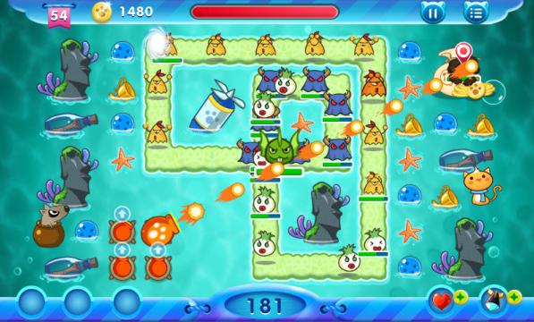 关卡评分机制,银、金、紫、皇冠,可追求完美通关,和朋友一较高低,看谁的技巧好。超萌可爱的怪物,发出可爱的叫声,如尖子、草头、蛋蛋、呆呆、幽幽、泡泡多达15种,会轮番攻击你的猫咪。每个关卡中的建筑物如飞碟、时钟、各种水果。。。都隐藏著大量宝藏,有金币、炸弹、协防抱塔。。。,等待你的挖掘。
