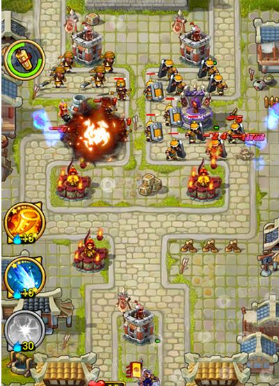 常言道:“运筹帷幄之中,决胜千里之外”。本作非常考验玩家的临场指挥能力,排兵布阵策略性很强。在闯关副本模式中,辅助技能的加入,让游戏玩起来更加的带感。玩家在指定的位置建造好防御塔之后,战斗时消灭敌人都会获得能量值。玩家可以利用这些能量值释放辅助技能来增加战斗力。本作一共有三种不同的辅助技能,分别为鼓舞、极寒冰雨和终极杀招雷霆万钧。其中鼓舞技能可以加速防御塔的攻击速度,极寒冰雨技能不仅能让敌人减速,还能造成一定的伤害。当面对一大波汹涌的敌军时,主公莫慌!赶紧使出杀手锏雷霆万钧吧!在短短的五秒钟内,你就是这个世界的主宰。滑板鞋的节奏立马响起,摩擦摩擦,在这光滑的屏幕上快速摩擦,有种神助的力量帮我把敌人都给消灭掉,有了雷霆万钧再强的敌人我都不怕,欧耶!