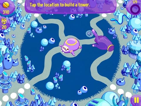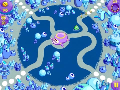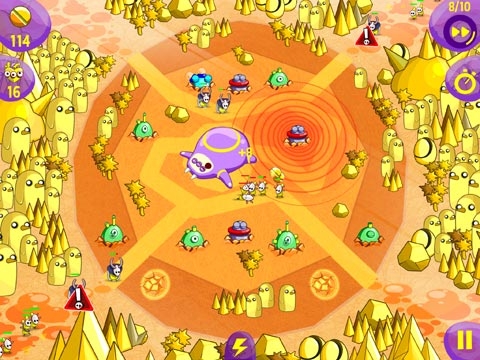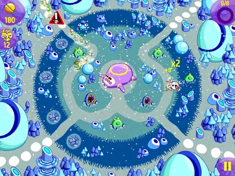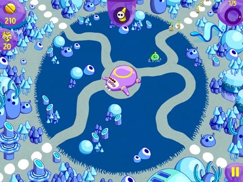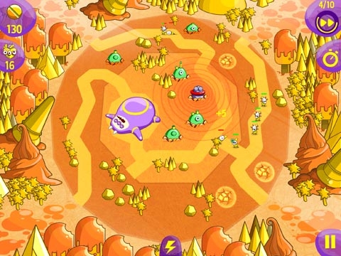 前面说到,这不是一款常规的塔防游戏,其中最大的创新就是可以一定程度上控制敌人的进军路线。画面中圆圈的部分都是可以用我们的手指触屏旋转的,最初的关卡只有一层可以旋转,而后续的关卡内外两层都可以旋转。而且更妙的是当旋转的时候敌人是暂停行动的,这就给了我们充裕的时间进行地图的调整。通过旋转的最大好处就是让敌人的进攻路线延长,或者是让敌人在我们防御最强的地方遭到更多的打击,这一切都用手指进行触屏即可做到,相比以前建塔之后就只能眼巴巴地看着敌人大摇大摆地前进,这样的玩法会让玩家的自主性更强,参与的热情自然也就更高了。