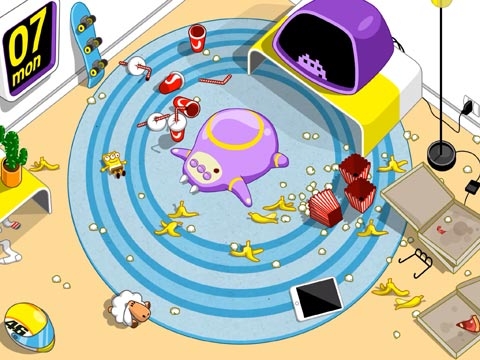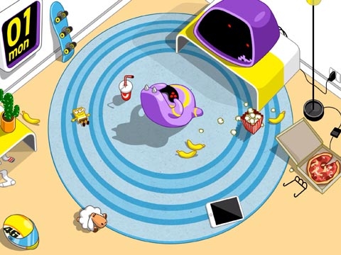 游戏的开始介绍了基本的剧情,一个有着三只眼睛的怪物正在家里看电视还是玩游戏来着,这个很像现实世界中的宅男的怪物还是个大胖子和瞌睡虫,吃着吃着玩着玩着居然就睡着了,我们的任务就是保护这个宅男,来抵御许多许多的小怪物的攻击。