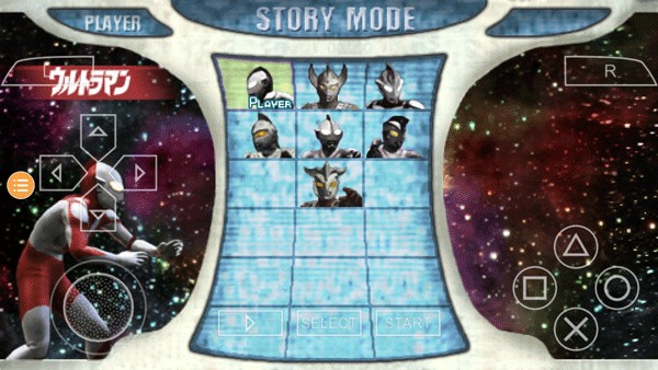 1、下载好奥特曼格斗进化0游戏后点击进入,可以看到首页,在左边的上下箭头选择模式,选好后在右边圆圈确定
