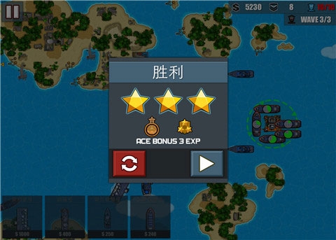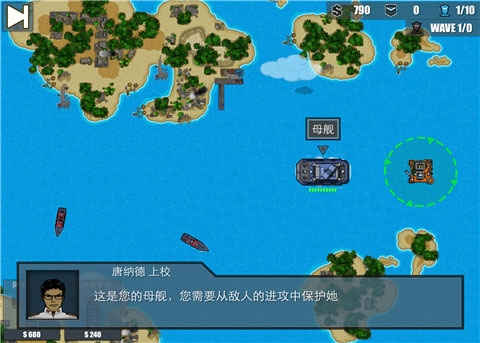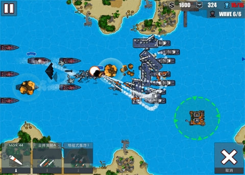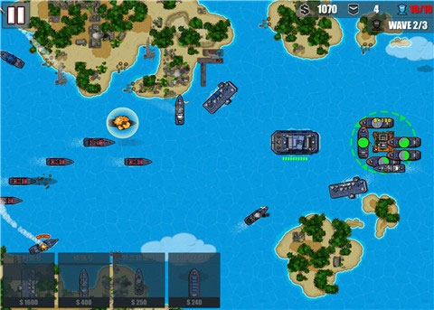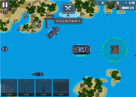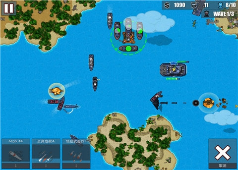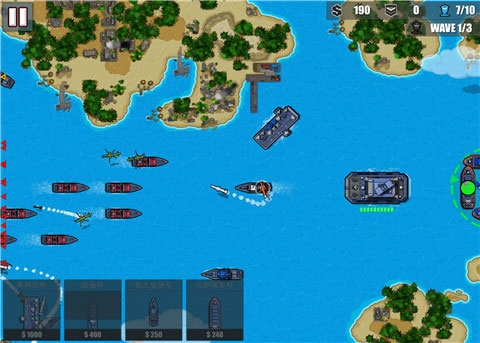 战斗开始,我方还有不少友军抵抗敌人,但我们并不能对他们进行任何操作。在这里并不是非常固定的塔防,没有建造固定箭塔的位置,取而代之的是我们的船舰,船舰可以自由移动,支援火力,可以说是一个高度开发的塔防。初始的时候只有四种船舰可以选择,行动缓慢的航空母舰但却有着直升机和飞机战斗,重型驱逐舰发射导弹,轻型战列舰,还有就是采油船。
