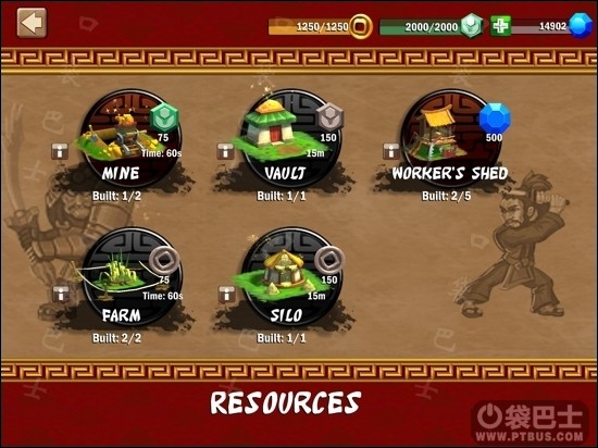 RESOURCES是资源界面,在里面可以直接使用钻石补充另外两种资源;