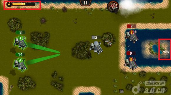 游戏中还有一个比较重要的设定,如上图右侧红框处,可以设定一次出兵的百分比。如果一次全出了,基地也就不安全了;而若是出兵太少,也很难拿下敌方基地,所以要好好权衡。